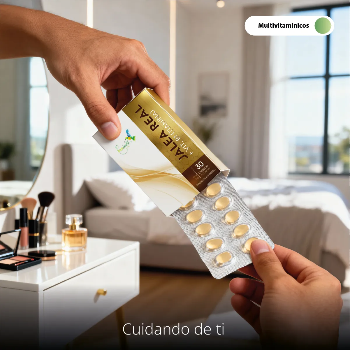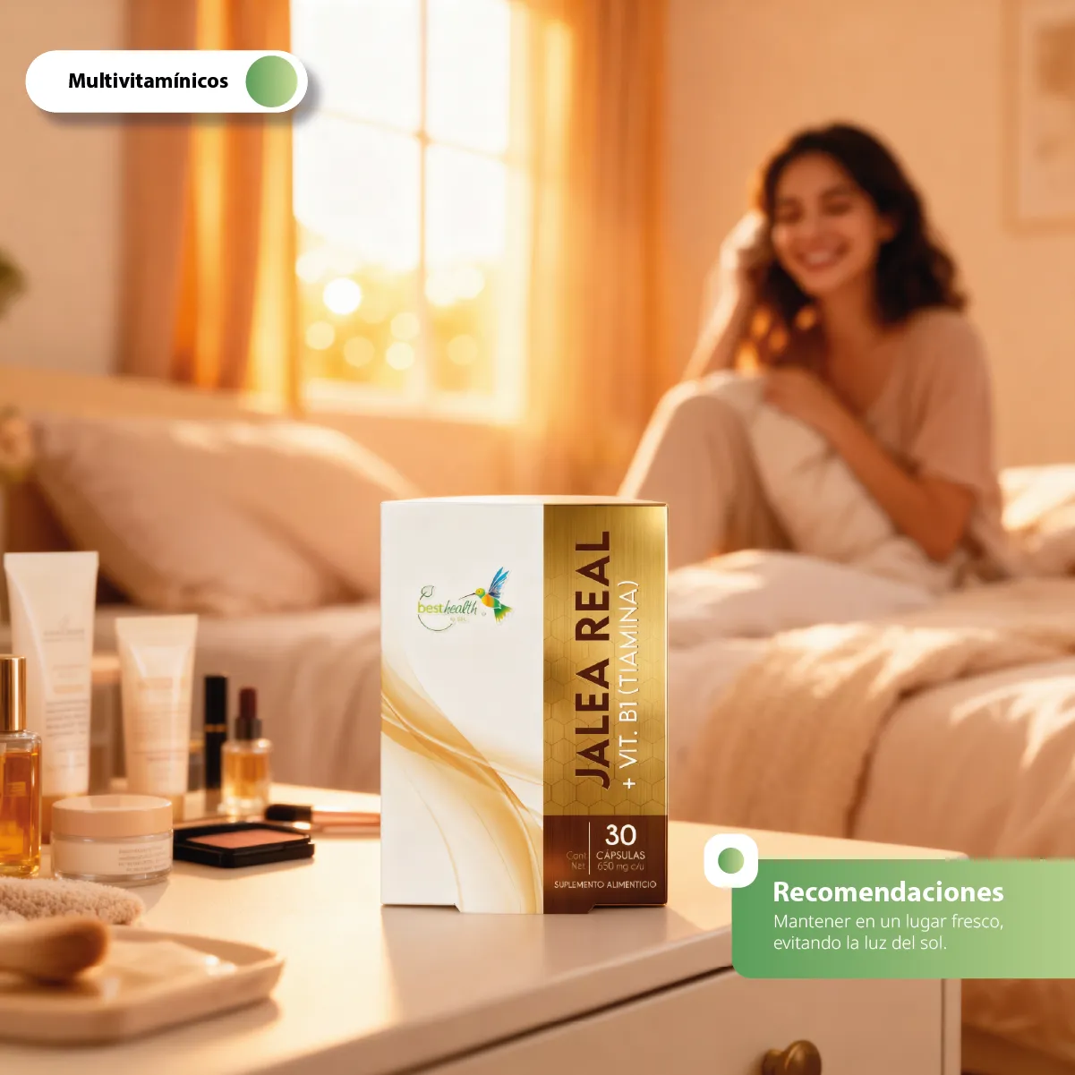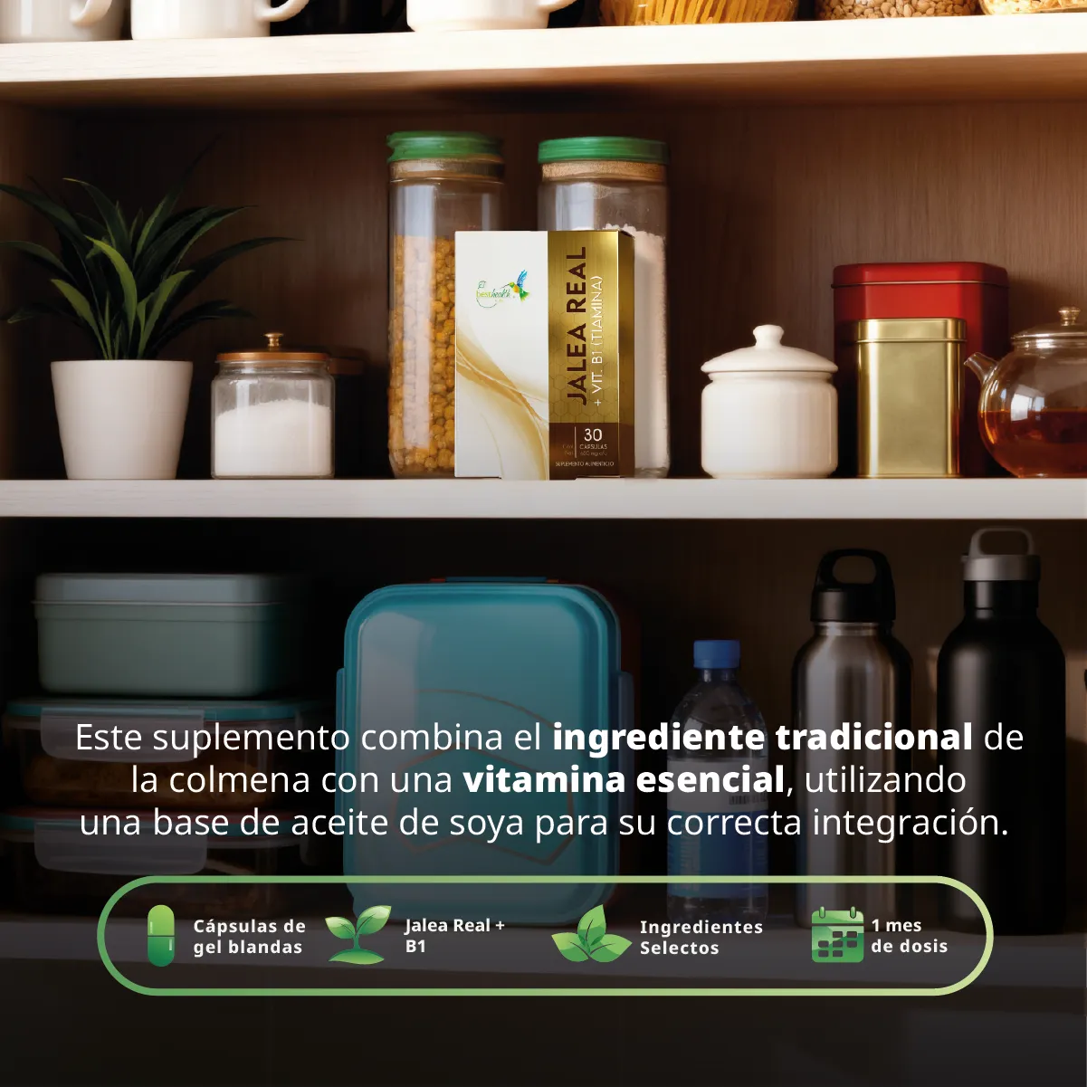 Best Health presenta su fórmula de Jalea Real enriquecida con Vitamina B1 (Tiamina), desarrollada para complementar tu alimentación diaria. Este suplemento combina el ingrediente tradicional de la colmena con una vitamina esencial, utilizando una base de aceite de soya para su correcta integración.