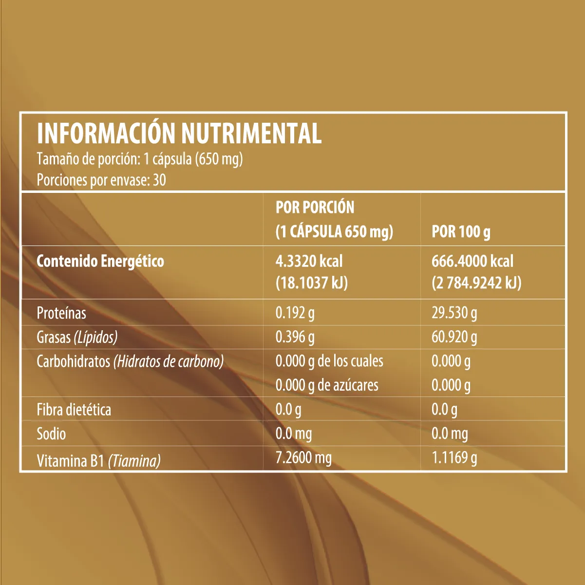 "Aceite de soya, grenetina, agua, caolín, glicerol, lecitina de soya, manteca vegetal, polietilenglicol, vitamina B1 (tiamina), jalea real, dióxido de titanio, color amarillo naranja FD&C y color amarillo huevo FD&C."
