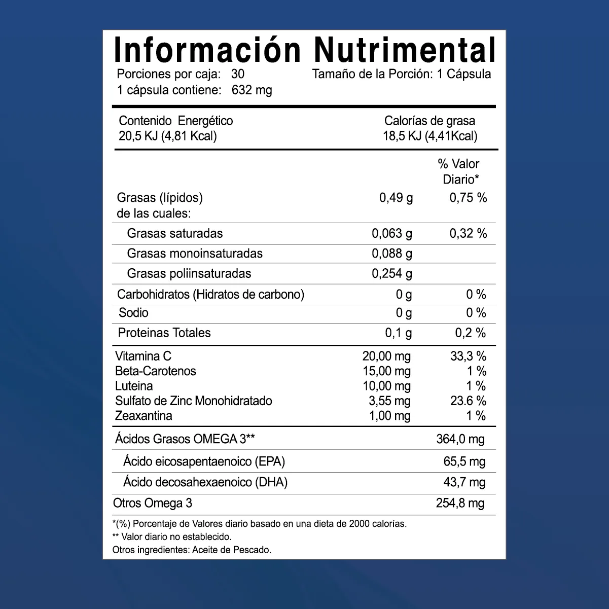 Fórmula con Omega 3, Vitamina C, Betacarotenos, Luteína, Zinc, Zeaxantina.